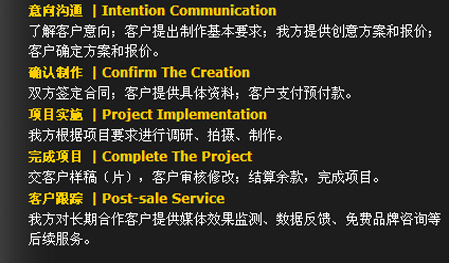 保證力——作業流程   我們一直相信,只有科學、規范的作業流程作為運作保障,優秀的創意才能得以完美的實施。在經典影視,我們一直秉承——策略精準 . 創意新銳 . 執行出色。